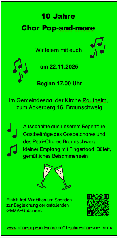 Am 22.11.2025 feiern wir in Rautheim ab 17.00 Uhr unser 10jähriges Chor-Jubiläum mit einem Konzert, Beiträgen anderer Chöre und einem Empfang.